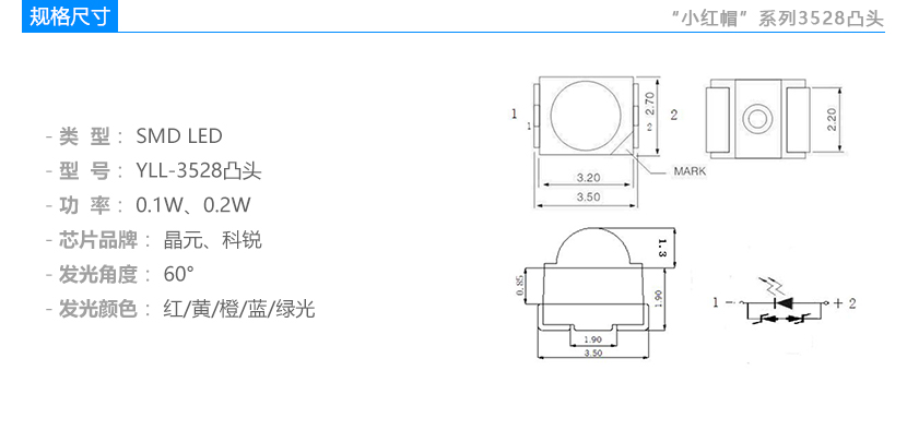 “小红帽”系列3528球头LED贴片灯珠参数: